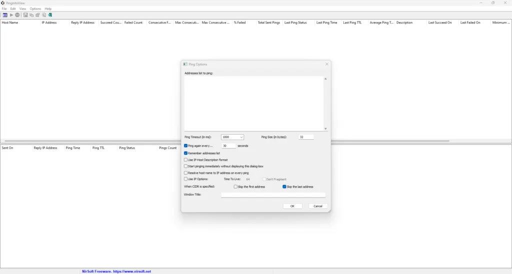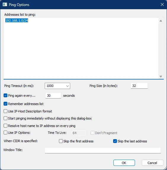 It offers quite a few ways to customize how your pings will work. You can ping entire subnets as well as individual machines. I generally will turn down the “Ping again every…” option to 1 second.