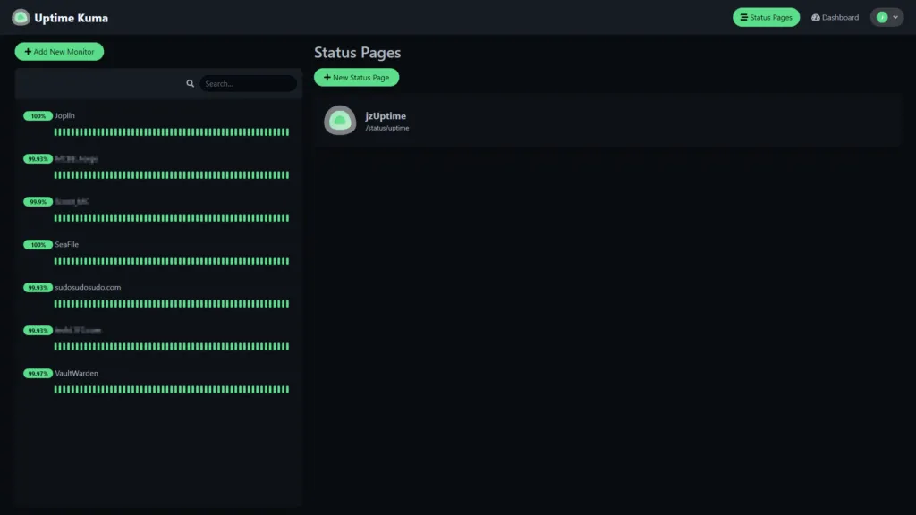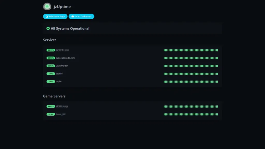 Uptime-Kuma offers possibly one of the simplest methods of providing an uptime monitor to your services. I currently have it set to notify me via a private discord server if a service becomes non-responsive, and the ability to create status pages allows me and friends to quickly check if a service went down recently. You can have multiple status pages, each customized with different services and the ability to have service alerts on those pages. You can also set your URL to redirect to a status page by default, keeping basic traffic away from your dashboard login.